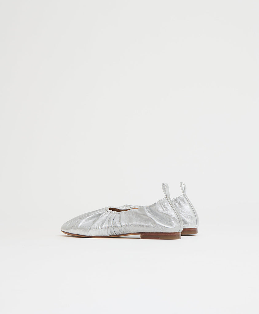 The Ruched Ballerina in Crinkle Silver reimagines the classic flat with a luminous metallic finish and artisanal detailing. Handcrafted from supple Italian leather, it features a gently ruched silhouette that contours comfortably to the foot. A padded sole and flexible construction ensure ease with every step—combining modern polish with timeless femininity.