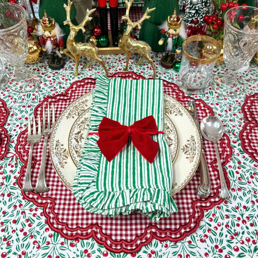 Swiss linen, fine cotton and tasteful refinement define Flying Sheep Country's linens and tabletop items. Founded by two sisters who spent their youth spotting sheep in the English countryside, the brand celebrates both luxury and whimsy in its vibrant prints, fine embroidery and traditional artisanship. The Ruffle Napkins in Green Stripe, Set of 4, offer a fresh twist on a timeless design. Featuring crisp green stripes and a softly ruffled edge, these napkins bring relaxed elegance to both everyday meals and festive gatherings.