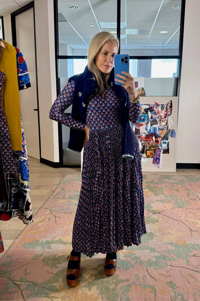 Hunter Bell strives to spark joy and inspiration with clothing that empowers women to embrace their personal style. The New York City–based brand is all about fashion-forward, fun looks, designed with detailed craftsmanship and exceptional wearability. The Sabine Dress in Autumn Fleur Navy is designed to carry you through the season with ease and polish. The fitted turtleneck bodice flows into a pleated skirt for a sophisticated silhouette, while the lightweight stretch jersey fabric ensures comfort and wrinkle resistance—making it an ideal choice for everything from everyday wear to fall travel plans.