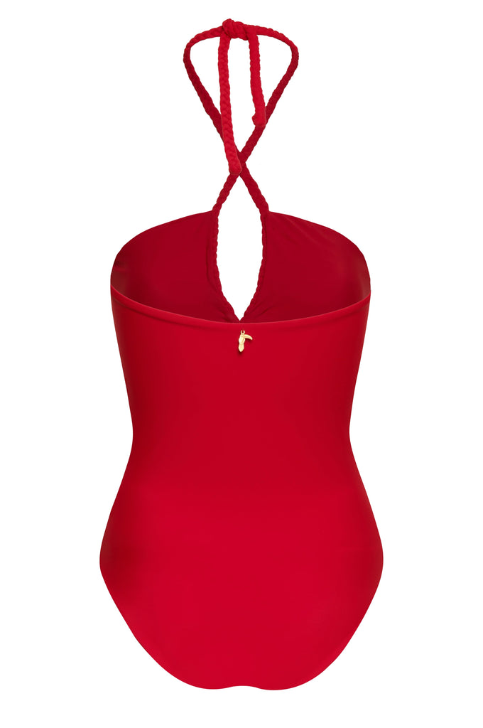 Founded in Cali, Colombia, Juan de Dios is celebrated for its fusion of craftsmanship, elegance, and modern design. The Saint Tropez One Piece in Red exemplifies this artistry with a striking silhouette that highlights the body’s natural grace. Featuring delicate ruching, a teardrop cutout, and a braided halter neckline, this piece is crafted in embroidered ECONYL® regenerated nylon — a conscious material that blends sustainability with sculptural sophistication.
