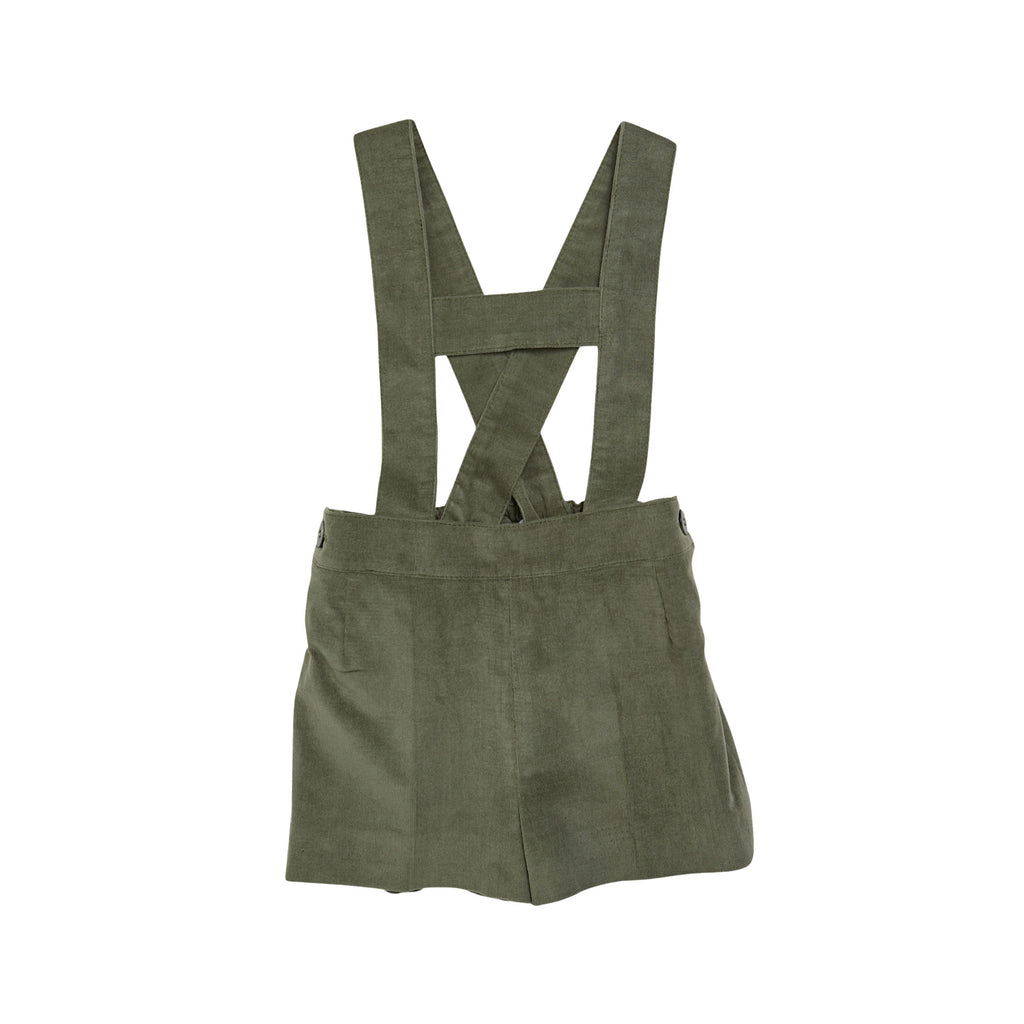 Soft khaki baby corduroy. Elasticated waistband with button closure. Crossover straps and back patch pocket detail. Comfortable and versatile design. Made in Spain.