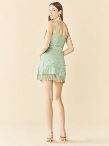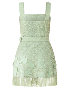 Tomboy looks, girly-girl styles, and an always fashionable approach define EDDY’s aesthetic. With a focus on bold and feminine silhouettes, EDDY dresses and tops pair elevated California bohemian with global inspiration; these are clothes designed to make you feel good inside and out. Made for movement—and making an entrance. The Sarah Bird Mini Dress in Minty Green features braided fringe hem that shimmies with every step. Hand-applied floral appliqué blooms over intricate mint lace, each motif placed with care. A cinchable waist and elastic back sculpt the shape without fuss. More than a dress—it’s wearable art with a disco soul.
