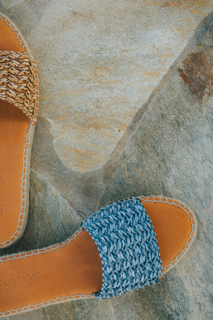 Inspired by the resplendent colors and simplicity of the Mediterranean, Le Mogador looks to redefine resort accessories with their minimal, luxurious footwear. Combining time-tested artisanry and tradition with modern fashion sensibilities, these are sandals that both embody, and feel at home, in the world’s most beautiful locales. An espadrille style sandal, with sea-toned straps on the upper, the Saran Sandal in Blue adds some height without taking away any ease or comfort.