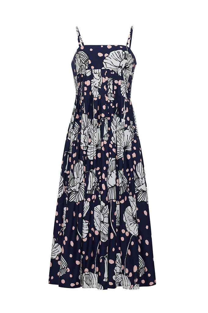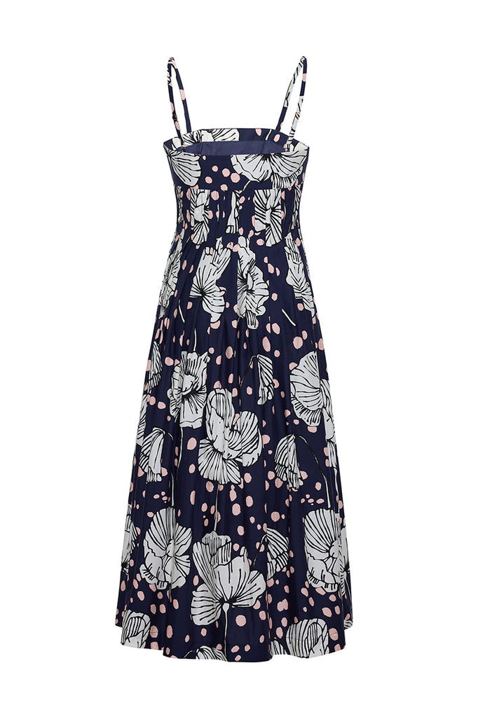 The Sea Island Dress in Dotted Flora Navy is a square-neck midi dress designed with a fitted bodice and adjustable spaghetti straps for a customizable fit. Bust darts and decorative pin tucks create a nipped waist that releases into a full A-line skirt, enhanced with a decorative seam detail at the hem. A side-seam invisible zipper with hook-and-eye closure ensures ease of wear. Designed for a fit-and-flare silhouette, the dress includes functional side-seam pockets and is elevated with a carefully placed print.
