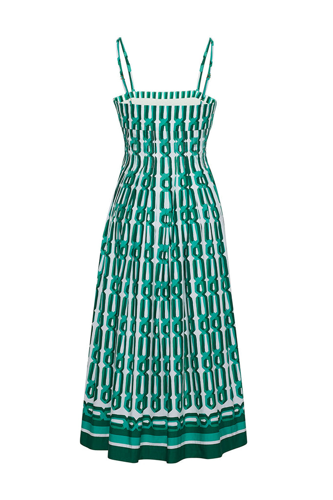 The Sea Island Dress in Martin Geo combines crisp tailoring with a feminine, fit-and-flare silhouette. Crafted from 100% cotton poplin, the square neckline and adjustable spaghetti straps frame the fitted bodice, while bust darts and decorative pin tucks create a nipped waist. The pin tucks release into a full A-line skirt, featuring a subtle seam detail at the hem. Functional side-seam pockets and a side invisible zipper with hook-and-eye closure complete the design, with a carefully placed print adding a refined graphic touch.