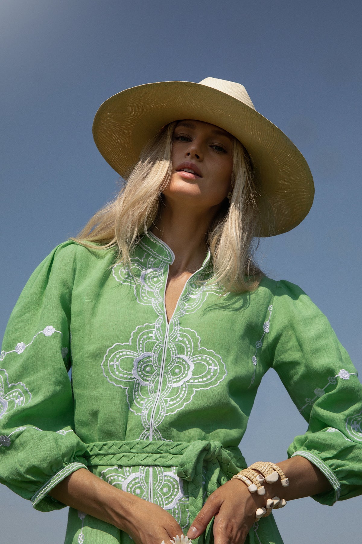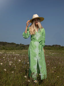 Inspired by art, architecture and the founder’s global journeys, ASHA by Ashley McCormick introduces bold, sophisticated jewelry and accessories made from only the finest materials. From everyday glamour to the red carpet, these statement pieces are classic additions to your collection. The Briar Caftan reinterprets ASHA’s beloved clover embroidery in a fresh seagrass green linen, accented with floral motifs and folk-inspired stitching. With a breezy silhouette and optional braided belt, it’s a feminine tribute to heritage craft and artisanal detail.