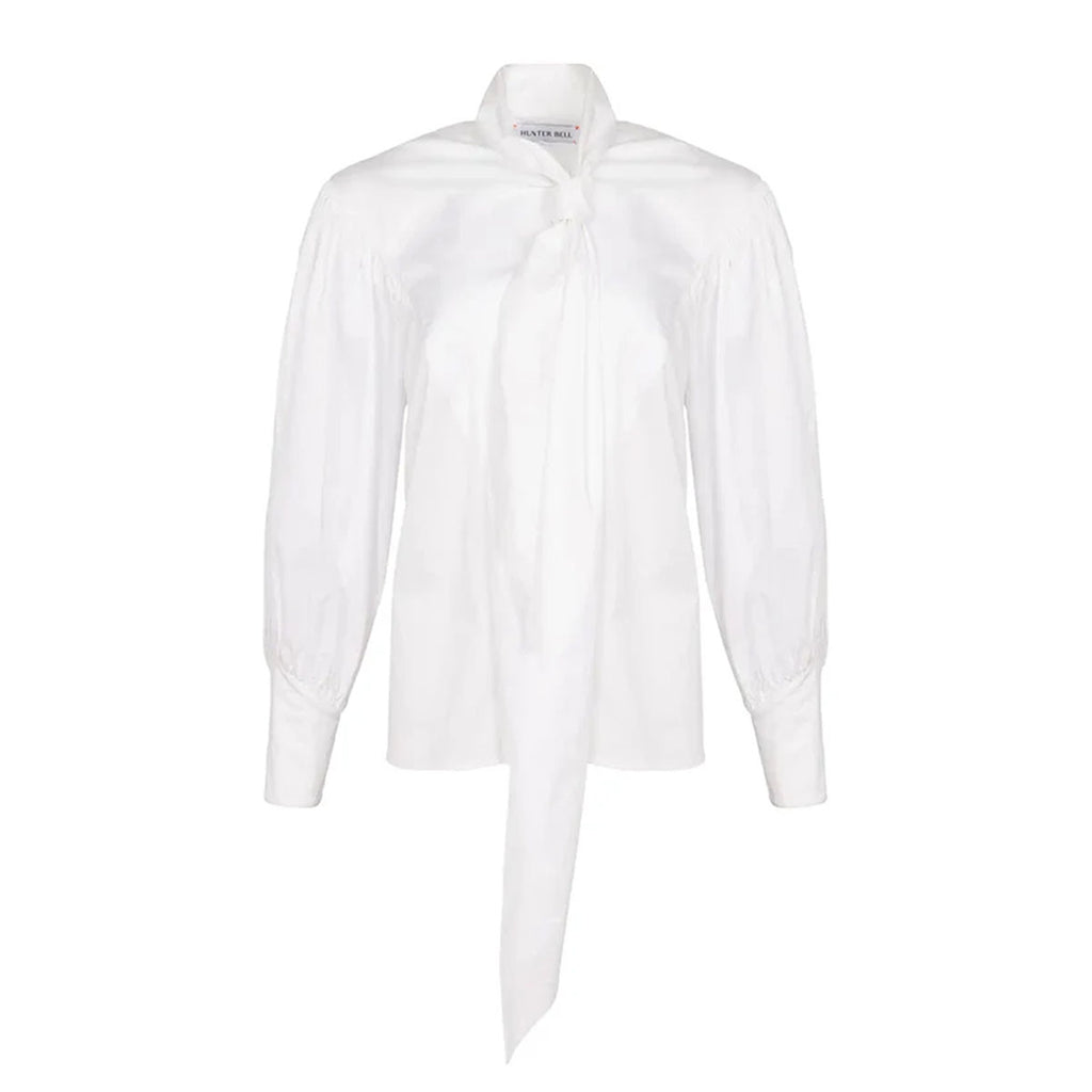 The Shay Blouse in Bright White offers a refined take on a beloved silhouette. Designed with a dramatic tie-front neckline that beautifully frames the face, it combines bold detail with effortless elegance. Long, full sleeves with angled button cuffs lend sophistication, while the relaxed fit brings ease to styling. Pair it with the Ida or Dominic Skirts for a timeless, polished look.