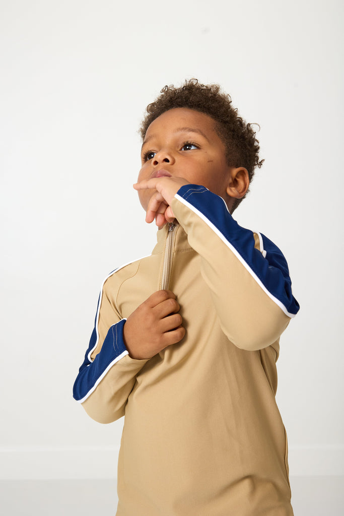 A polished blend of style and sport, Courtside Kids reimagines children’s activewear with performance fabrics, modern tailoring, and a classic athletic sensibility—made for everywhere from the playground to the country club. The Sideline Half-Zip in Khaki with Navy Stripe is the ultimate layering piece, combining buttery-soft comfort with timeless athletic style. Designed with a custom CK zipper and subtle contrast stripe detailing, this pullover is stretchy, smooth, and sensory-friendly—perfect for pairing with joggers or shorts during in-between weather days.
