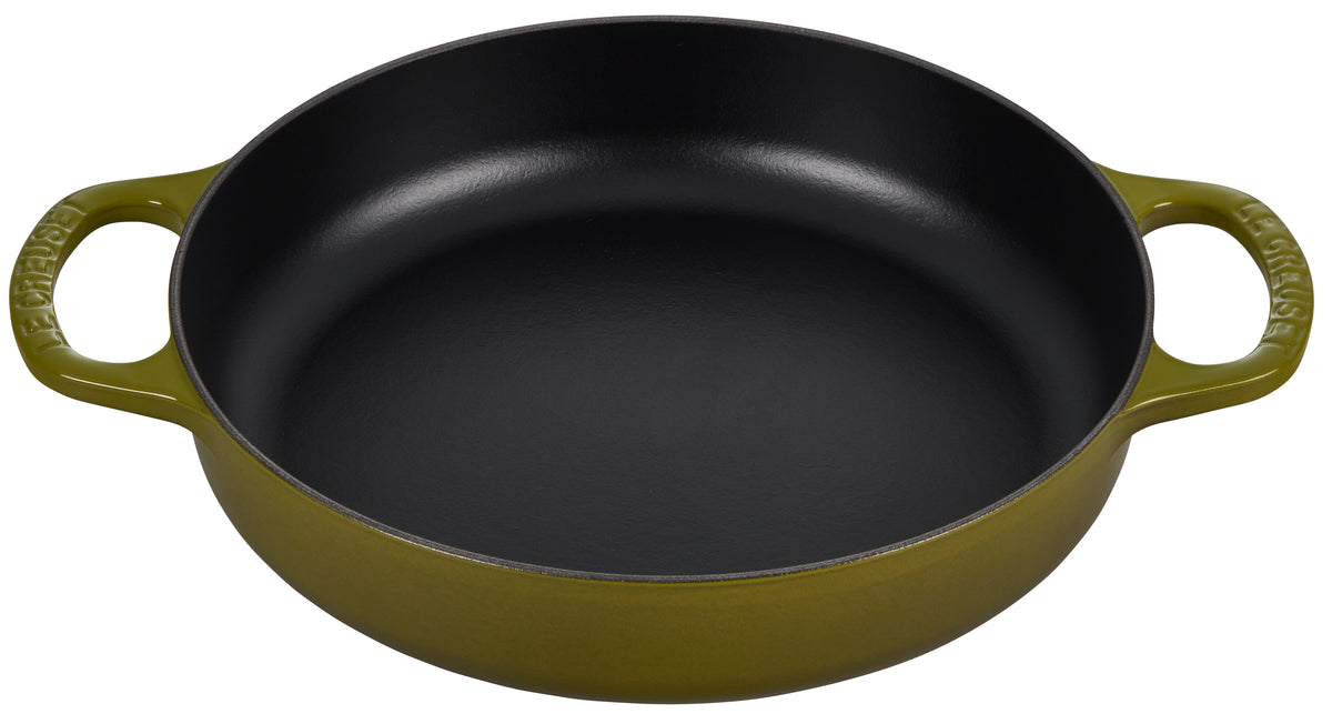 Recognized for its strength and durability, as well as its beauty and quality, Le Creuset produced the first enameled cast iron cookware nearly a century ago. A tradition of maintaining the finest culinary craftsmanship, combined with the latest innovations, means Le Creuset is made for home cooks and professional chefs alike. With a generous depth and wide surface area that is perfect for everything from pan roasting and frying to one pan meals, the Signature Everyday Pan in Olive combines the benefits of a braiser with the ease of use of a fry pan.