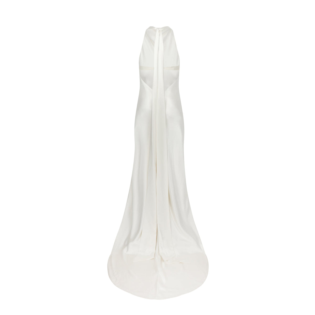 Handmade at its London atelier, The OWN Studio’s signature style combines pared-back, contemporary silhouettes with unexpected vintage details resulting in considered, minimal styles for the modern woman. The label brings a fresh and contemporary approach to wedding and evening wear. The exquisite level of craftsmanship and attention to detail of the OWN atelier is evident when looking at the incredibly sleek cut of the Silk Halter Dress with Organza Back Strap | STYLE 029. Delicate folds around the neck create a flattering and soft shape while the back is fastened by a long trailing sash tie, crafted in the same lustrous silk satin. While the dress is completely backless, the waist remains cinched at the front by a clever illusion silk organza strap at the back. A long flowing train creates beautiful movement.