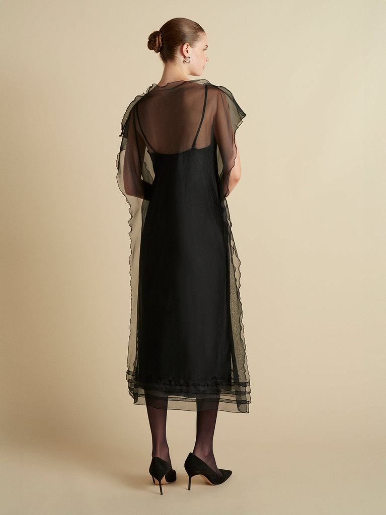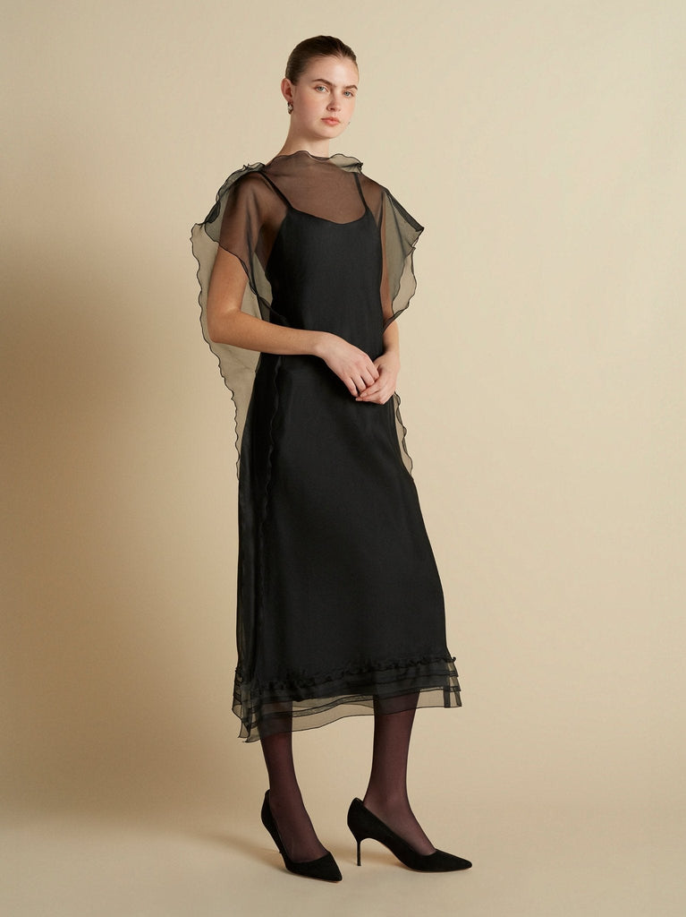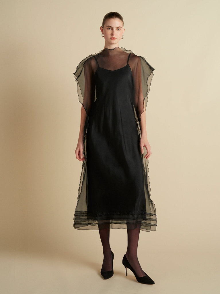 Founded in 2016 by sisters Marina and Francesca Moscone, the label gravitates toward a tactile approach, twisting and draping fabrics by hand to create a softly seductive design using custom jacquards, fil-coupés, and silk wools, all exclusively developed in Italy, rendered in precise shapes and tailoring. The Silk Organza Sack Dress with Scalloped Edge in Black reflects this philosophy with a fluid silhouette, delicate scalloped finishing, and a removable satin bias slipdress that allows for versatile styling. A study in lightness and refinement, it balances ethereal sheerness with architectural precision.