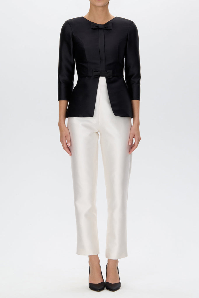 The Silk and Wool Cigarette Pants offer a polished foundation for refined dressing. Tailored in a luxurious silk and wool blend, this high-waisted silhouette is cut in a streamlined cigarette style that elongates the leg with effortless sophistication. Thoughtfully finished with a concealed back zipper and full lining, the design balances classic tailoring with a modern, graceful sensibility.