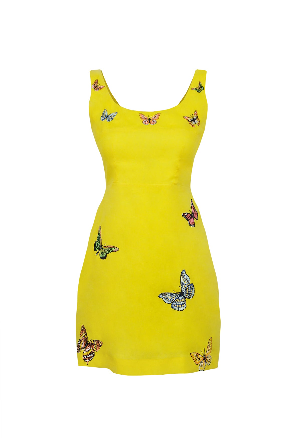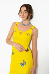 100% cotton. Mini dress with a fitted bodice, scoop neckline, and sleeveless silhouette. Embellished with butterfly embroidery on the front and back. Back zipper closure. Length: 32.9".