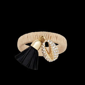 Inspired by her mother’s flair for holiday decorating, Joanna Buchanan has turned her love of travel and knowledge gleaned from twenty years in fashion retail into an eclectic line of tabletop, barware, gifts, and decor. Have you ever met a tassel you did not like? Set a table with these skinny, raffia-wrapped napkin rings. The tassels are handmade and the gold-colored brass pukas boast hand-set crystal stones.