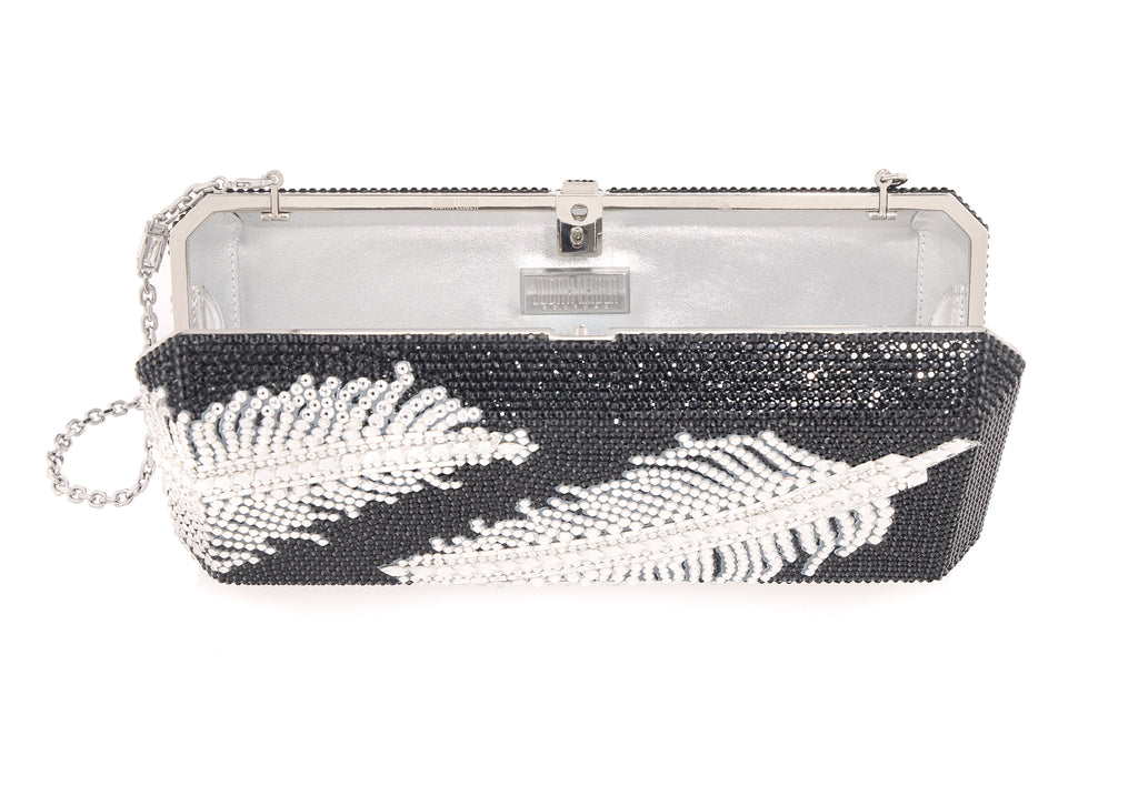 Judith Leiber is an iconic American accessories brand known for its meticulous attention to detail and flawless hand craftsmanship. Counting First Ladies, including Jackie Kennedy, and A-listers from Beyoncé to Jennifer Lawrence among its many acolytes, the label impresses with its signature take on luxury. The Slim Rectangle Jeweled Plume clutch marries modern minimalism with poetic flourish, its sleek crystal-encrusted frame serving as the canvas for a luminous feather motif in silver and white crystals. It’s elegance in motion, capturing light and imagination alike.