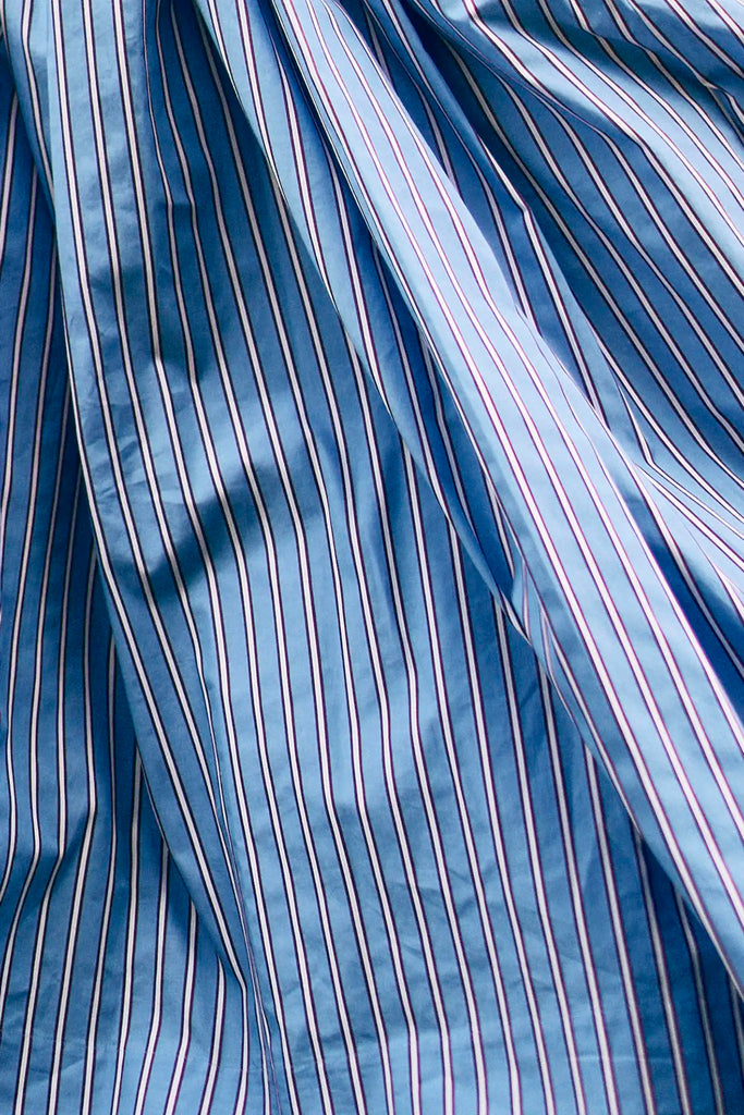 100% cotton. Marfa Stripe print. Wrap-style silhouette. V-neckline. Banded short sleeves. Fitted waist. Midi-length skirt. Unlined. 49" from top of shoulder.