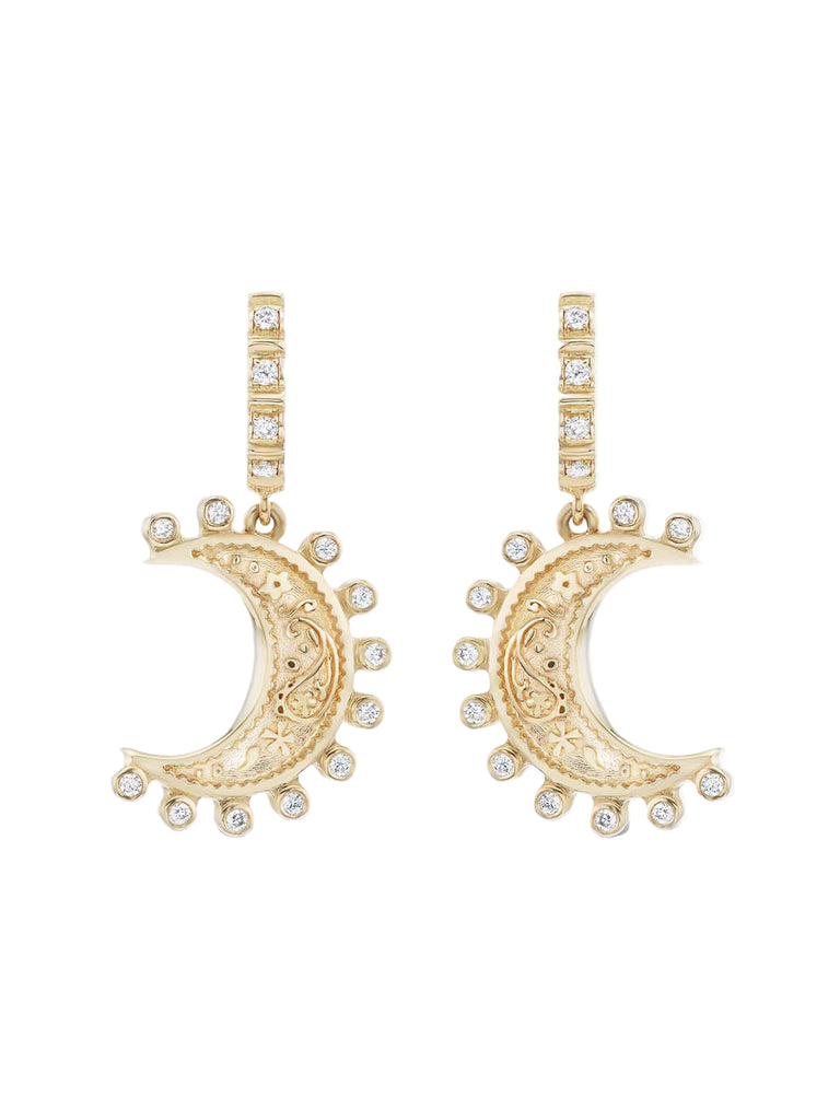 Founded by designer Jesse Marlo Lazowski, Marlo Laz captures the spirit of travel and the poetry of place through fine jewelry steeped in symbolism and storytelling. The Small Southwestern Moon Earrings, from the *Desert Rising* Collection, pay tribute to the stark beauty and artistic heritage of the American Southwest. Centered around a luminous crescent moon motif, each earring is encircled with brilliant diamonds that shimmer like stars in the desert night—an ode to nature’s quiet grandeur and timeless mystique.
