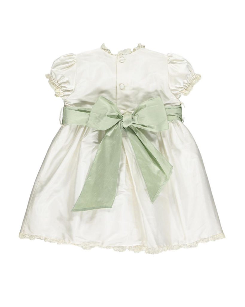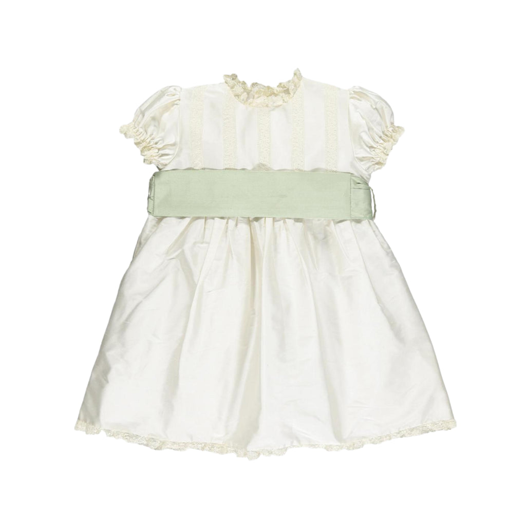 The Sofia Dress in Silk Mint embodies timeless elegance and refined craftsmanship. Crafted from 100% silk, this exquisite celebration dress features short puffed sleeves, a trio of covered buttons at the back, and a belt loop to secure its statement bow. The over-the-knee skirt is finished with a petticoat for graceful volume and sophistication. A beautiful choice for flower girls, birthdays, or any special occasion, this design exudes charm and poise in every detail.