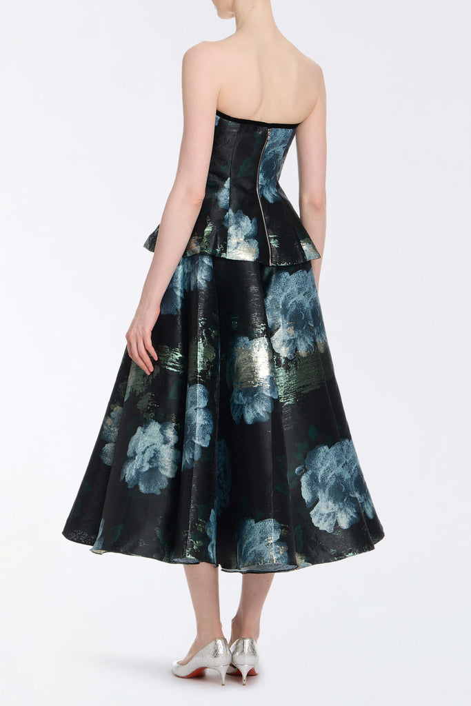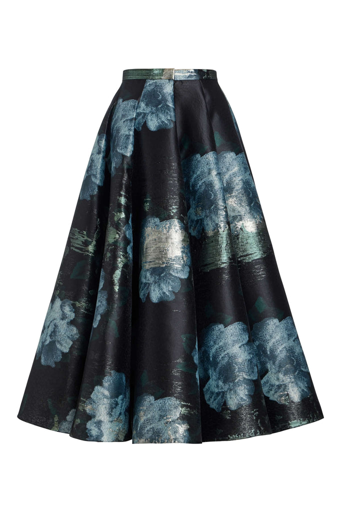 86% polyester, 14% metalized polyester. Lining: 100% silk. Concealed zip along back. Fully lined. Made in the USA.