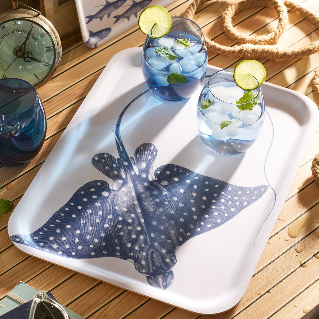 Caskata makes dinnerware for those who love to entertain. That joie de vivre and celebratory atmosphere makes its way into each piece of the brand’s blend of classic and contemporary designs, recognizable by their creative patterns, enduring quality, and light touch. The Spotted Stingray Large Rectangular Birchwood Tray features a beautiful sea creature: the spotted stingray, affectionately named Sonny. Archival details bring texture to this graphic new friend from the deep, it is a welcome addition to any coastal table.