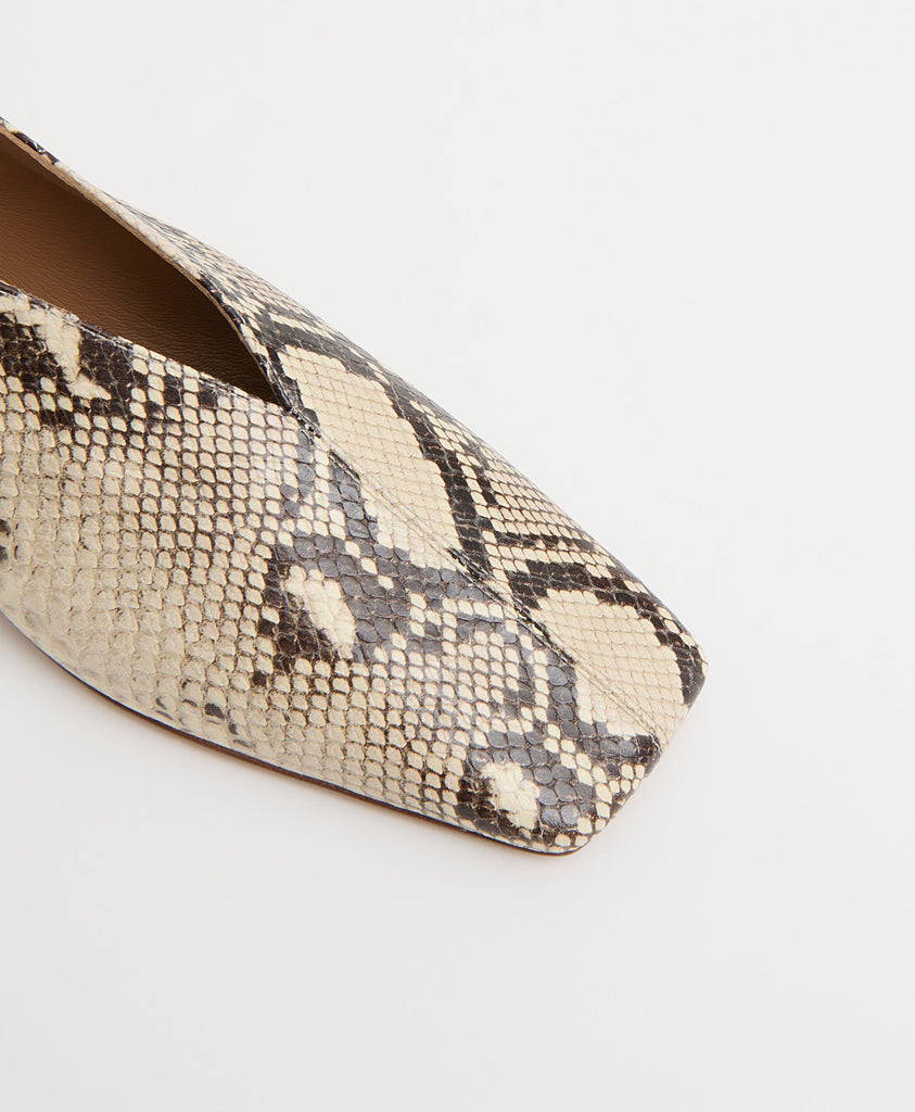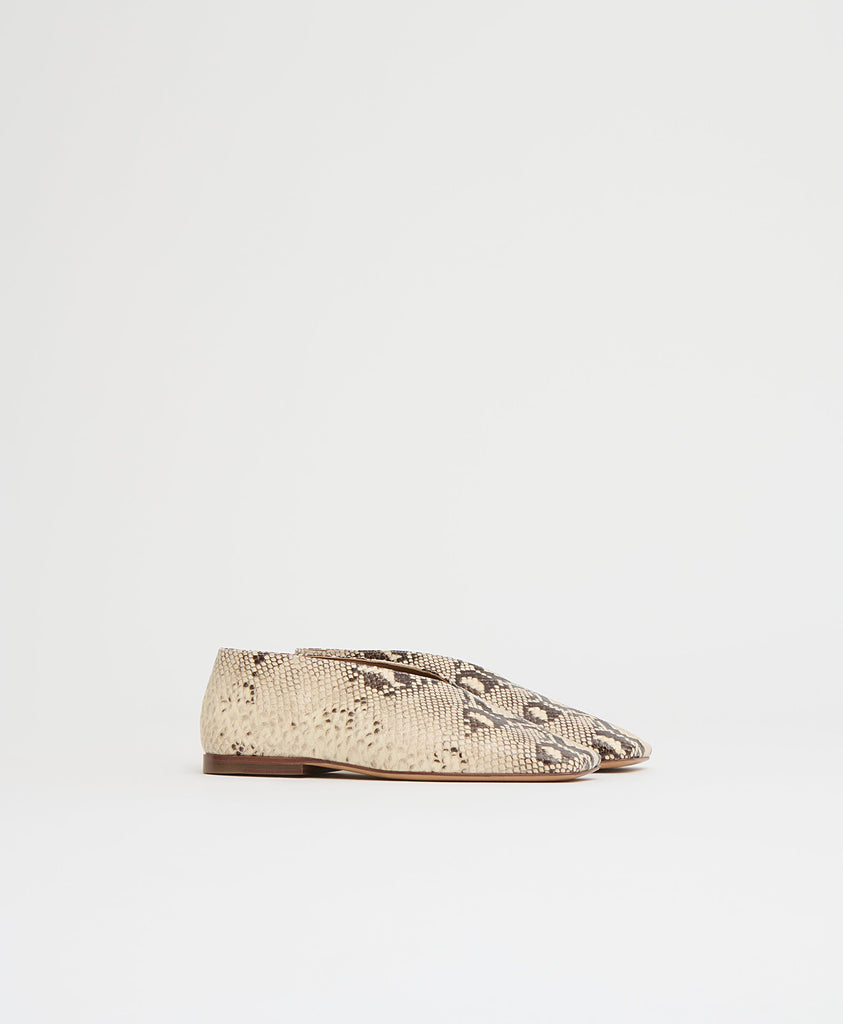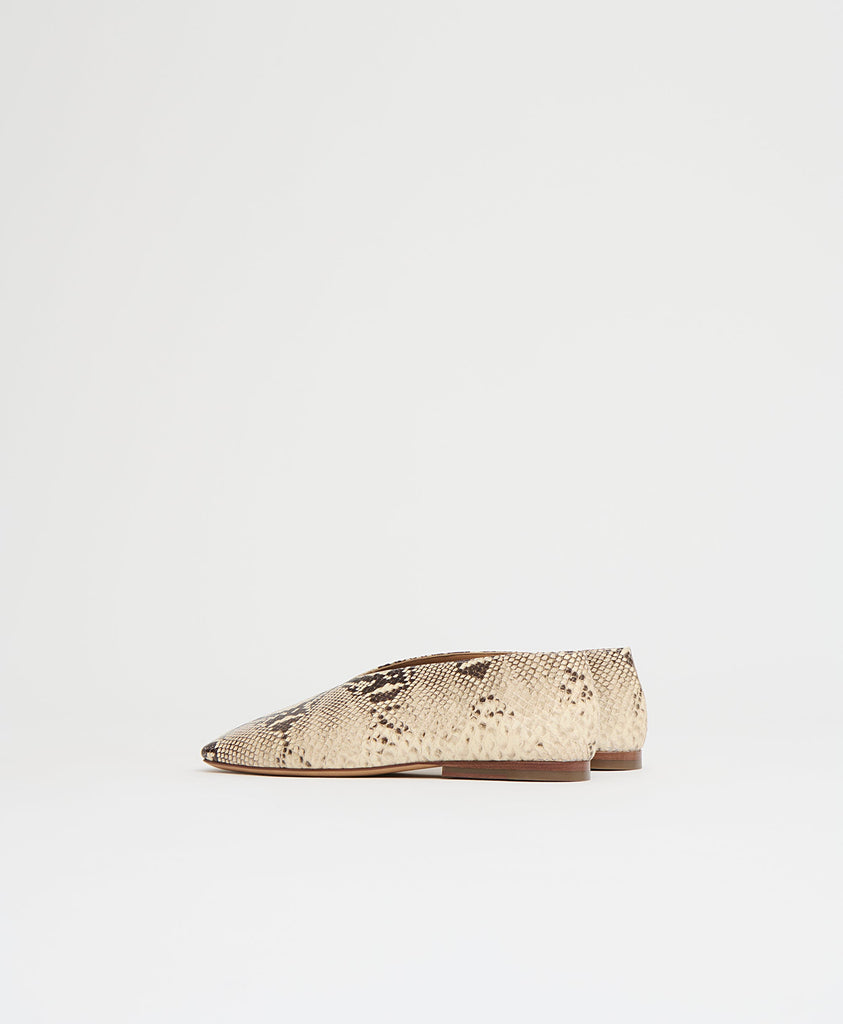 The Square Soft V in Roccia offers a refined balance of structure and ease. Crafted from stamped Italian leather, this flat features a squared toe and low V-cut vamp that elongate and flatter the foot. A padded insole and flexible sole ensure lasting comfort, while its sculptural shape brings a modern edge to everyday elegance.