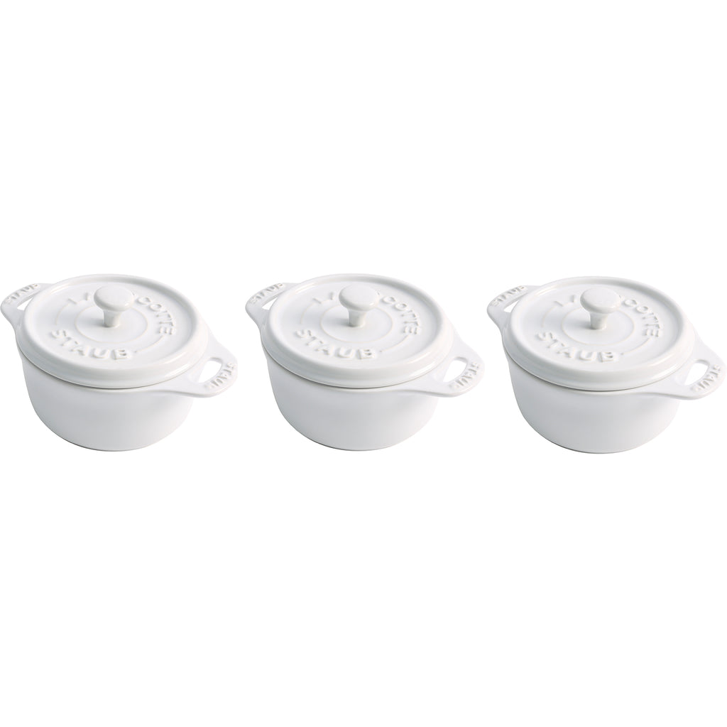 The elegance and functionality of Staub ceramics go from freezer to oven to table. The glass porcelain finish matches Staub's cast iron to mix perfectly on your tabletop. Oven and broiler safe up to 572˚F, ceramics can also be used in the microwave and are dishwasher safe. Highly scratch, impact, and thermal shock resistant. The Staub Ceramic 3-pc Mini Cocotte Set is a versatile addition to any kitchen. Store salt and pepper on the counter for quick access, bake up individual desserts or serve your favorite mac & cheese recipe.