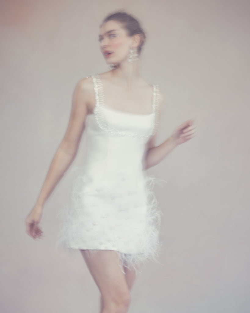A graduate of the Savannah College of Design, award-winning Alexandra Pijut created her namesake line to offer luxe ready-to-wear pieces that distinguish themselves between femininity and practicality. Exclusive to Over The Moon, the Stella Dress is adorned with delicate clusters of translucent beads and real feathers for an ethereal look. The Stella Dress offers the slightest touch of pink within the handcrafted embellishments. This festive mini is designed for a slim cut, with crystal detailing that wraps around the neckline, making it a charming addition to any bridal trousseau.