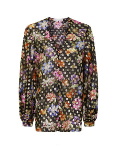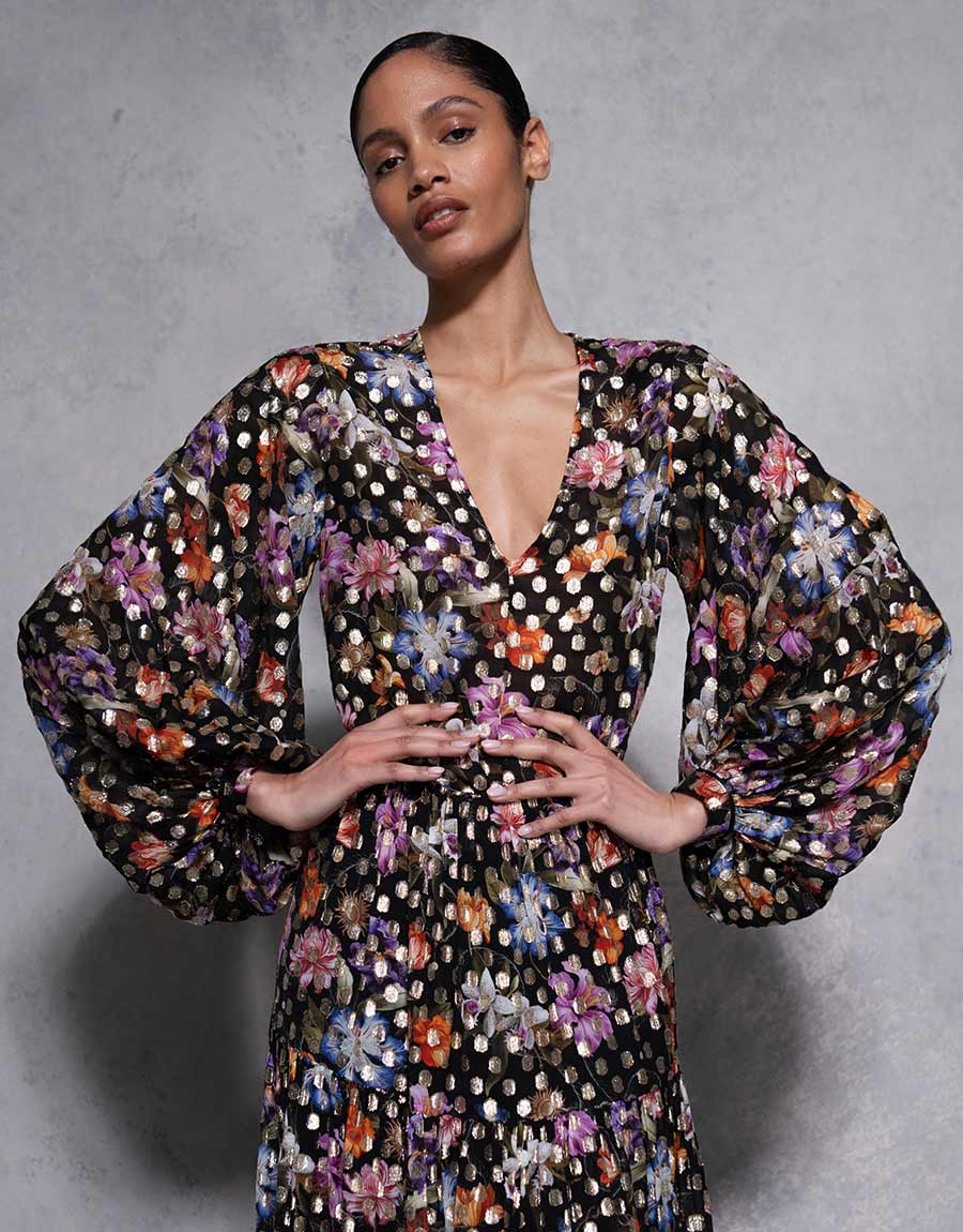 Inspired by the great art museums of the world, Carmen Borgonovo and Joana de Noronha use romantic silhouettes and surreal, bespoke prints, to create dresses that not only empower women, but transport them. These versatile, tailored pieces will bring joy to your wardrobe, and glamour to your world. Bohemian inspired with its deep v-neck and billowing sleeves, and crafted from a sparkly lame silk, the Stellan Lamé Top in Painterly Flower features a floral print of orchids and intricate gold jewels weaving between the blooms.