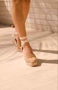 Inspired by the resplendent colors and simplicity of the Mediterranean, Le Mogador looks to redefine resort accessories with their minimal, luxurious footwear. Combining time-tested artisanry and tradition with modern fashion sensibilities, these are sandals that both embody, and feel at home, in the world’s most beautiful locales. An espadrille style wedge, the Stilvi Sandal in Nude offers a little of everything: contrasting tones and textures in its elevated, natural raffia upper, height in its wedge style heels, security in its ankle ties, and comfort in every step.