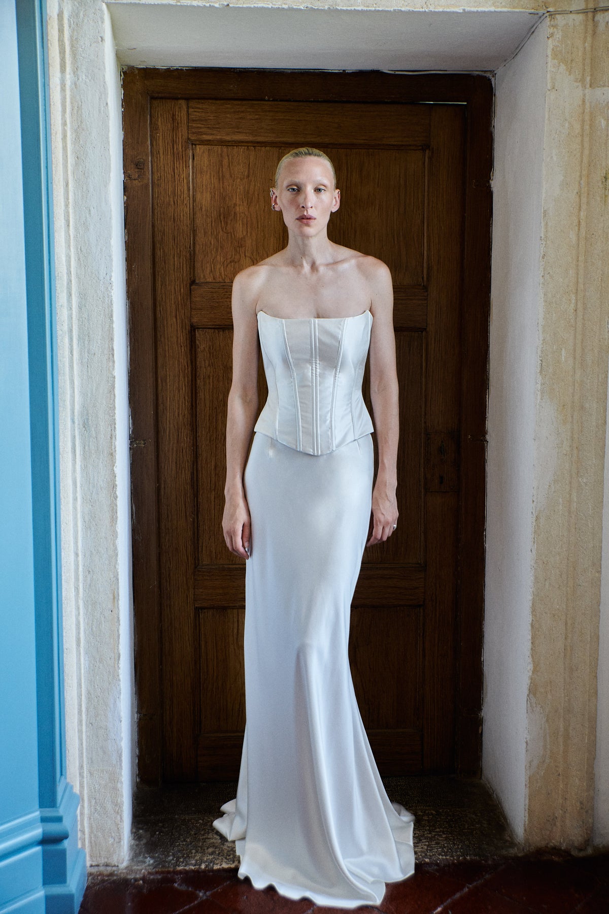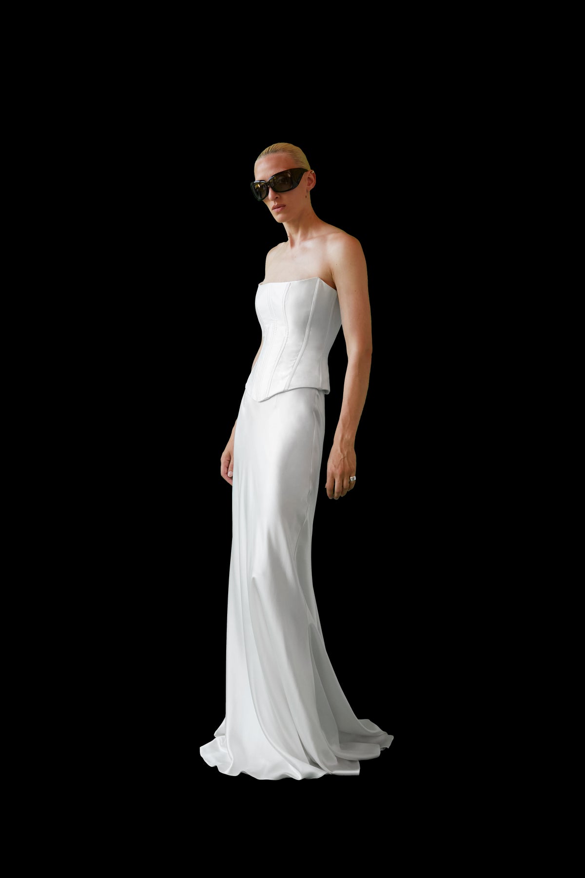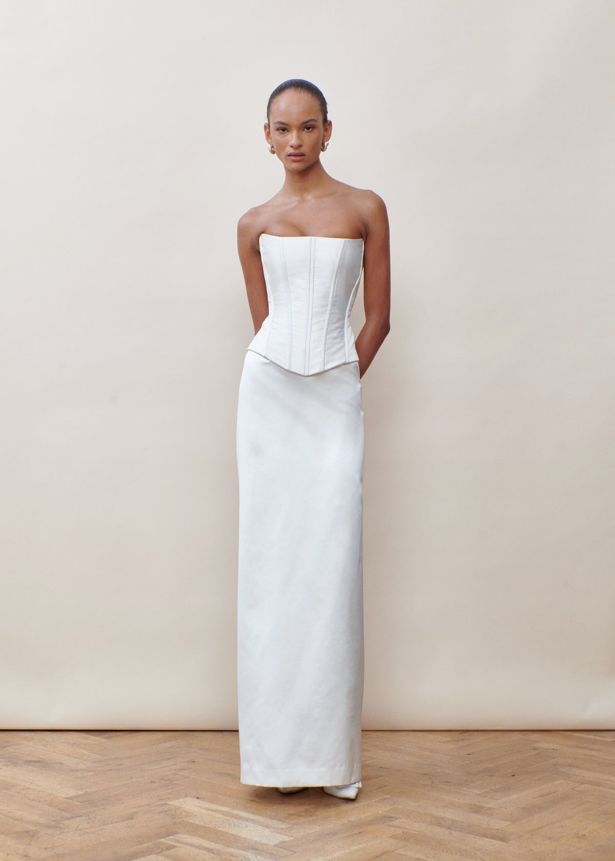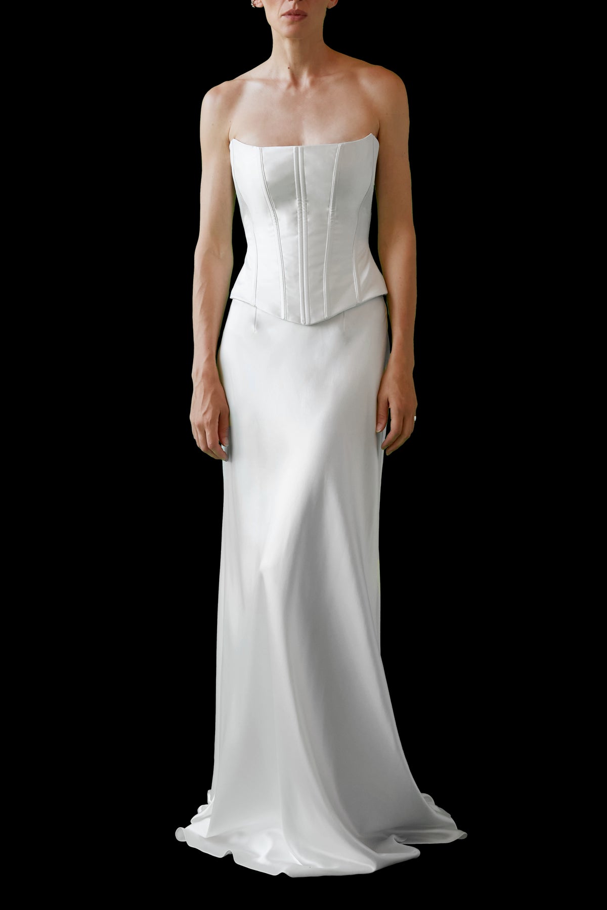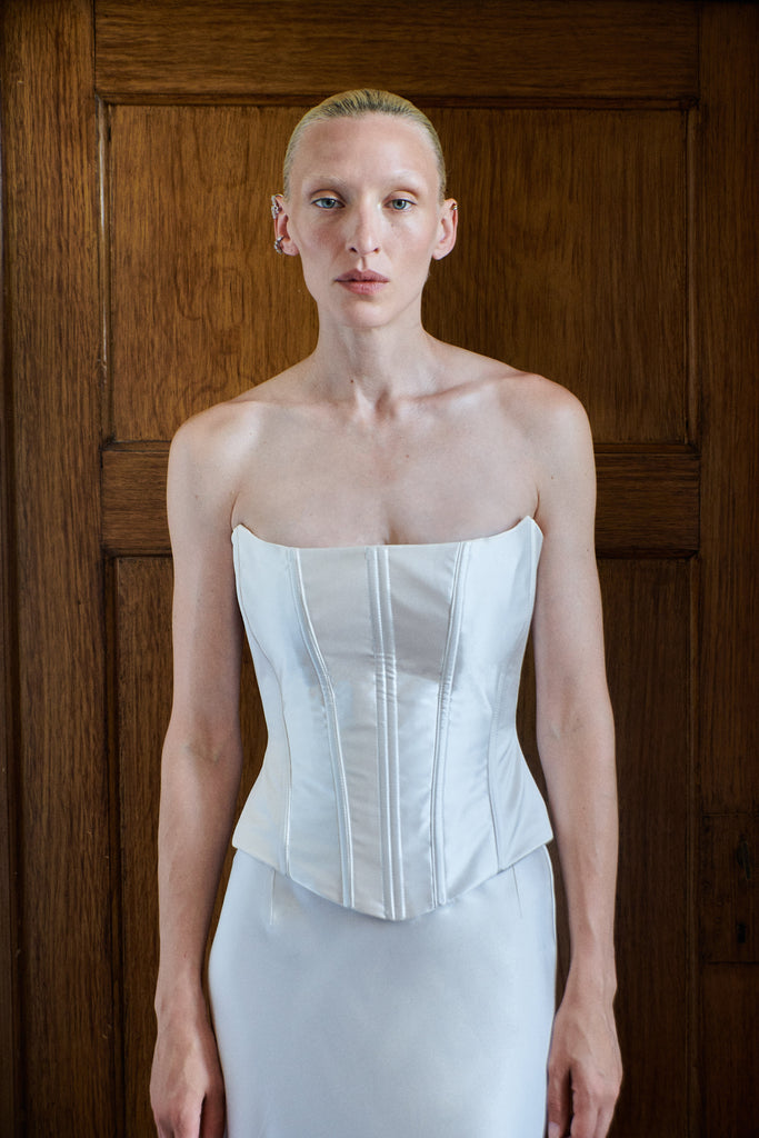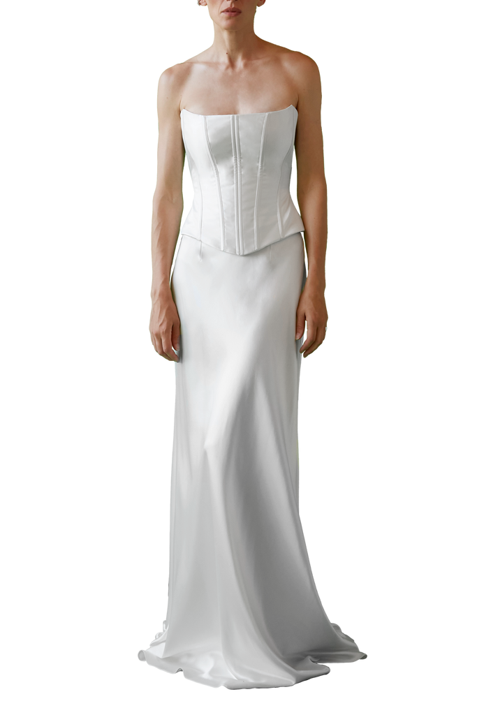 Handmade at its London atelier, The OWN Studio’s signature style combines pared-back, contemporary silhouettes with unexpected vintage details resulting in considered, minimal styles for the modern woman. The label brings a fresh and contemporary approach to wedding and evening wear. Expertly constructed by one of the industry’s most revered corsetieres, who has perfected his craft over decades of creating iconic burlesque corsets, the Strapless Corset | STYLE 140 combines unmatched artistry with a flawless fit. With its sculptural design and exquisite craftsmanship, this corset is both incredibly timeless and contemporary, at the same time. A studio favorite among bespoke clients, this piece is styled here with STYLE 145, the duchesse column skirt.