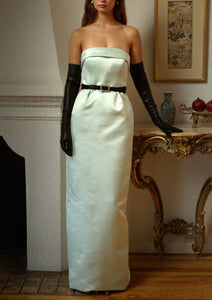 Known for using exquisite textiles from the finest European mills, Barbara Tfank’s collections are classic and timeless in French brocades, Italian silks, intricate jacquards, and more. Cut in a glamorous silhouette, the Strapless Slim Waisted Gown boasts sumptuous double-faced satin in a delicate mint green shade.