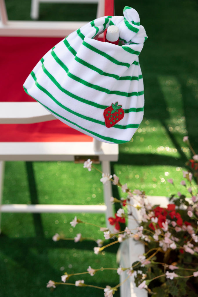 Taking inspiration from vintage tennis fashion, Club & Court employs modern fabrics and silhouettes, as well as a soft palette and bold prints to produce sporting attire, skirts and dresses that accommodate and elevate an active lifestyle. Crafted in luxurious velour, the Strawberry Mini Tote Bag features a white and Kelly green stripe, a stylish strawberry patch, and adjustable straps. We love it for keeping our phone, makeup, keys and other essentials courtside.