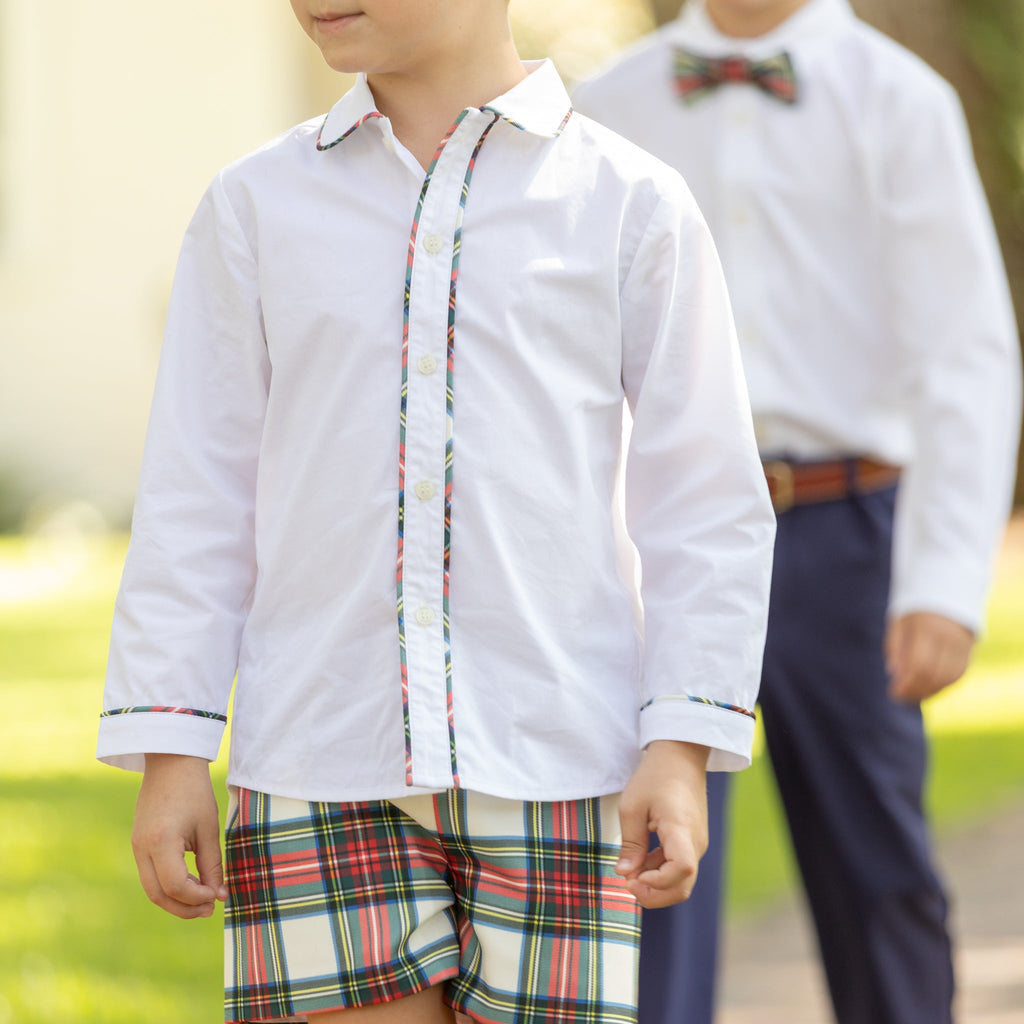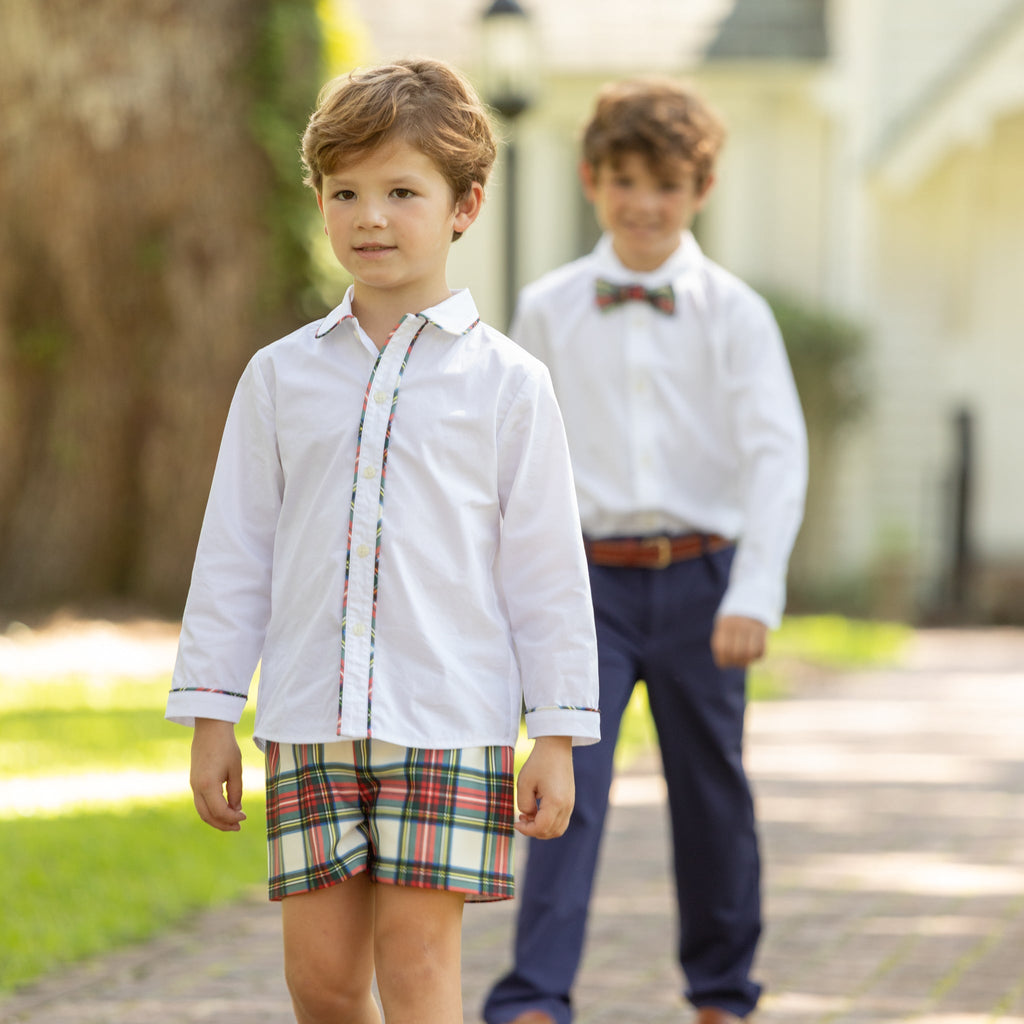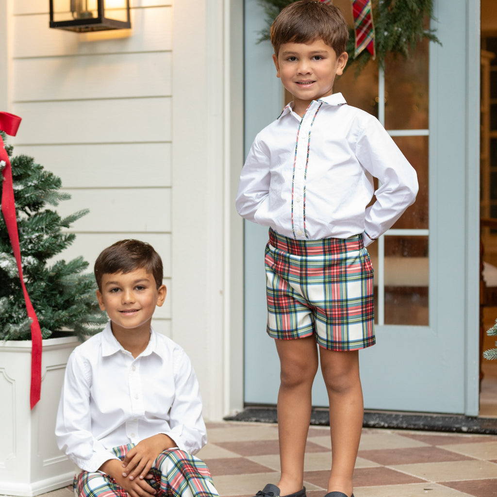 A celebration of the spirit of boyhood, the updated classics from Henry Duvall are curious, imaginative, and sweet. Full of character and playful details, these are easy-to-care-for clothes that families will love. The Sullivan Short Set in Townsend Tartan captures the joy of the season in classic holiday style. This two-piece set includes a crisp white cotton poplin top with tartan piping and coordinating plaid shorts, creating a polished yet comfortable look. Designed for memory-making moments, it’s an heirloom-worthy ensemble that shines in portraits, family gatherings, and festive celebrations alike.