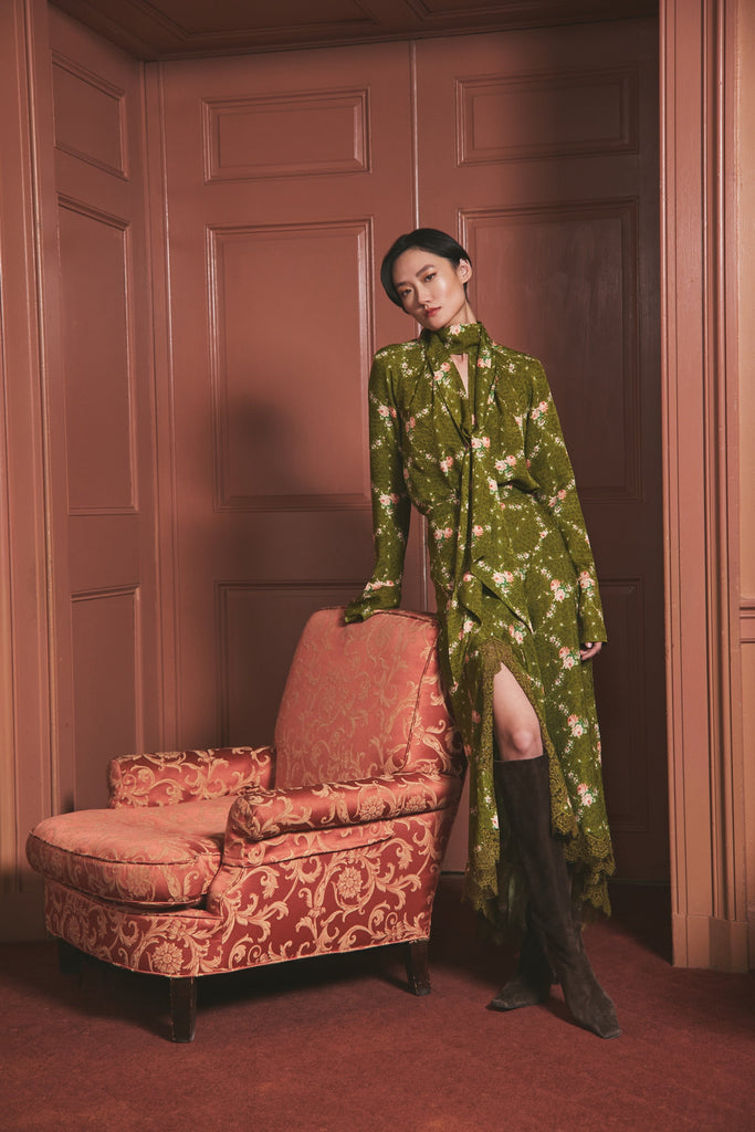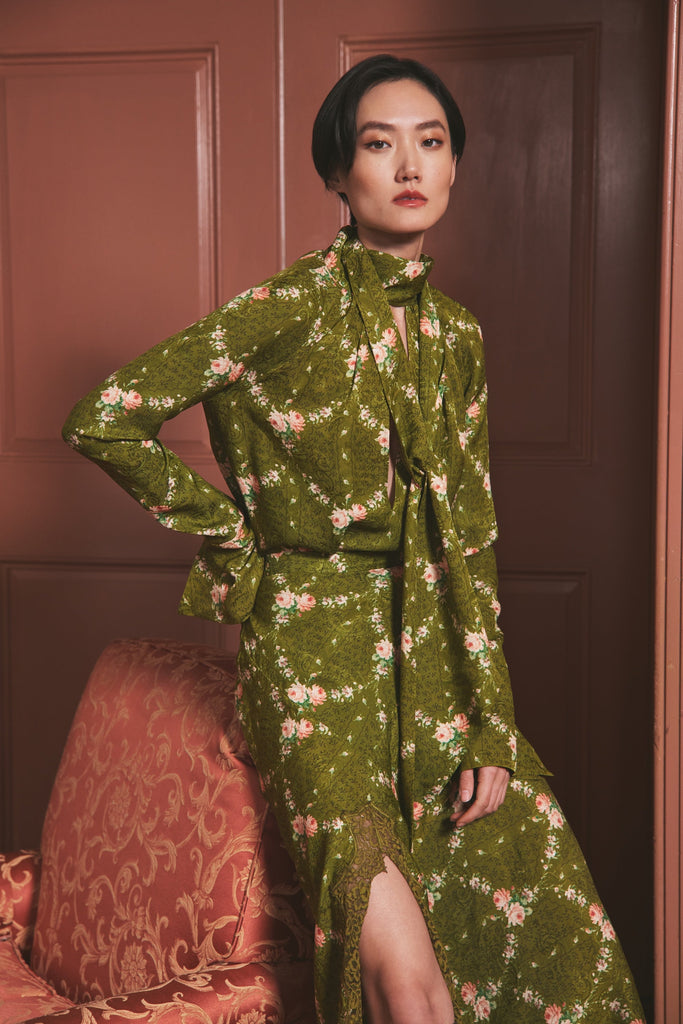 Founded by three New York City-based mothers who met through their kids, Cara Cara’s hallmarks include crisp poplin, house-designed prints, and casual glamour. The inspiration for their ethical womenswear comes from interior design, as well as the world’s most exotic locales. The Sundance Top in Trellis Olive is a fluid, feminine blouse with a distinctive silhouette. Designed with a mock neck and long ties, it features a deep-V cutout at the neckline, fluted cuffs, and an elliptical high-low hem. Gold-rimmed shank buttons add a refined touch, while the allover print lends visual intrigue.