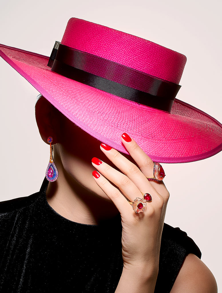 London-based Anabela Chan’s background in architecture and luxury fashion led to the first fine jewelry line to champion laboratory-grown gemstones. Today, its artisanal craftsmanship and sustainable innovations have found a place in the collections of royals, Rihanna, Taylor Swift, and sophisticated women worldwide. The Sunset Elixir Earrings are a show-stopping pair designed with the brand’s signature Fruit Gems™, gemstones synthesized from fruits and vegetables with bio-resin. Crafted in 18K yellow gold vermeil with 14K gold posts, each detachable earring features Blue Spirulina Fruit Gems™ cabochons paired with a radiant blend of fuchsia, orange, and rose pink sapphires for multidimensional brilliance. Wearable in two striking variations, they embody Anabela Chan’s visionary fusion of color, craft, and conscious design.
