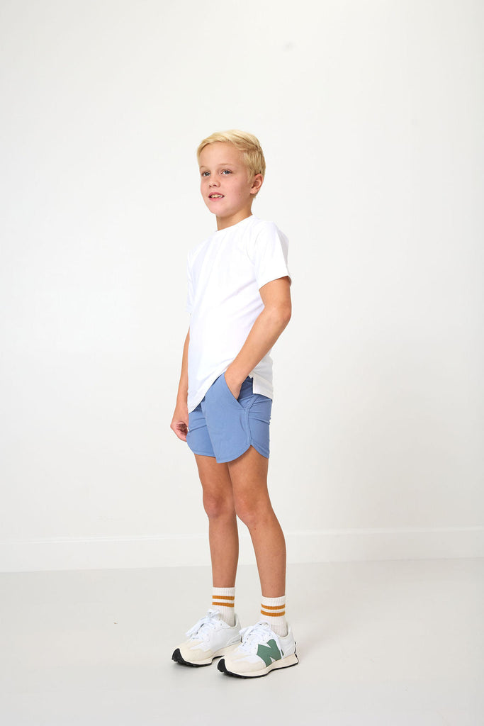 A polished blend of style and sport, Courtside Kids reimagines children’s activewear with performance fabrics, modern tailoring, and a classic athletic sensibility—made for everywhere from the playground to the country club. The Super Short in Slate is a modern essential designed for comfort, style, and movement. Crafted from ultra-soft, four-way stretch performance fabric, it features a built-in liner with anti-odor protection and roomy pockets for every adventure—whether that’s collecting treasures, heading to practice, or spending the day on the court.