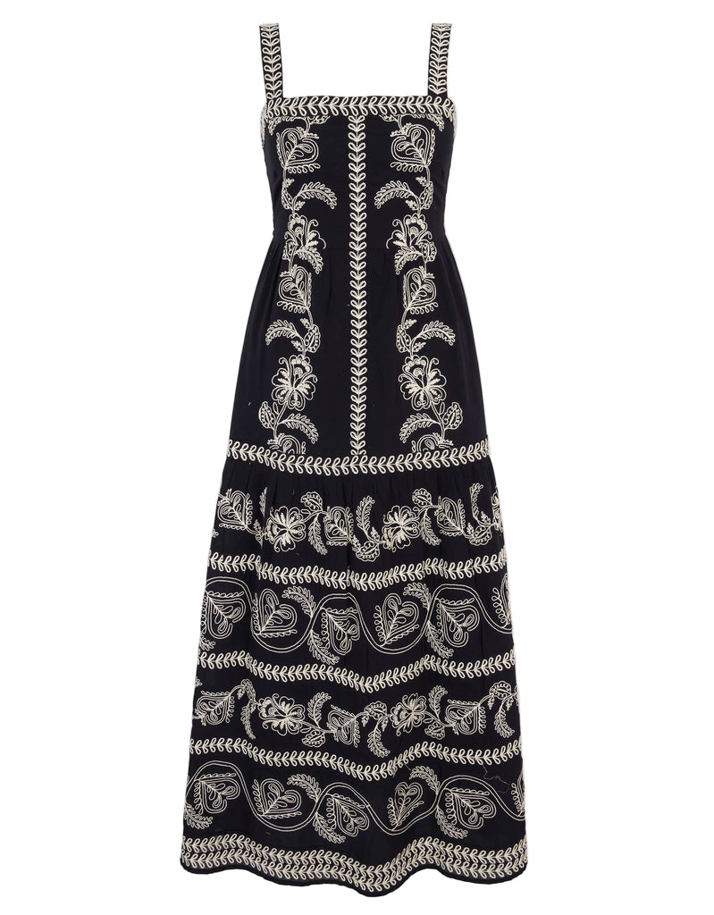 The Sweetheart Cord Embroidery Rio Dress is a romantic statement silhouette crafted from rich black organic cotton poplin and intricately embroidered with loveheart and floral motifs. Designed with embroidered straps, a flattering drop-waist, and an elegant tiered skirt, it brings effortless drama to festive gatherings, holiday evenings, or any moment that calls for something special.