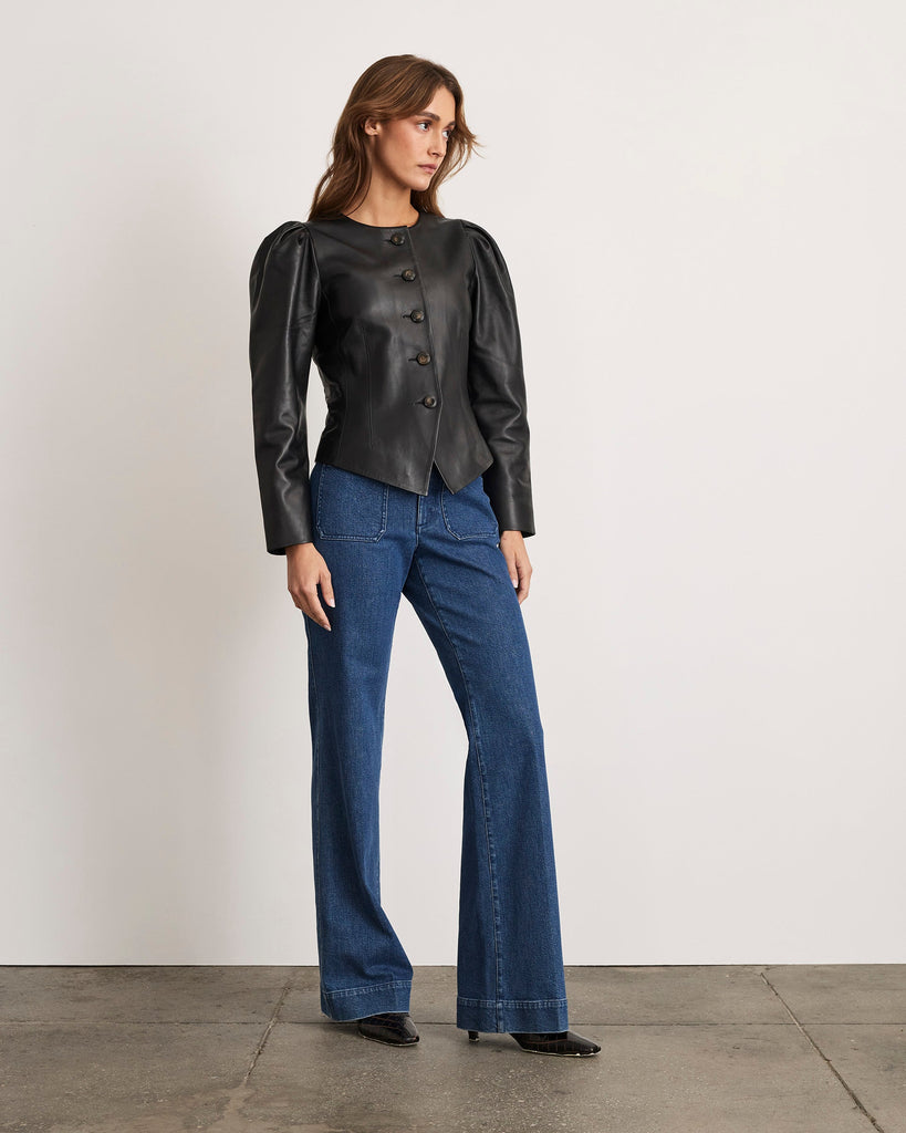 The Sydney Jacket in Black redefines classic tailoring with a modern, feminine edge. Crafted from supple leather, this fitted silhouette features a crew neckline, subtle puff sleeves, and a sleek button-front closure. Detailed with refined proportions and a smooth finish, Sydney adds polish and attitude to any look, effortlessly transitioning from day to night.