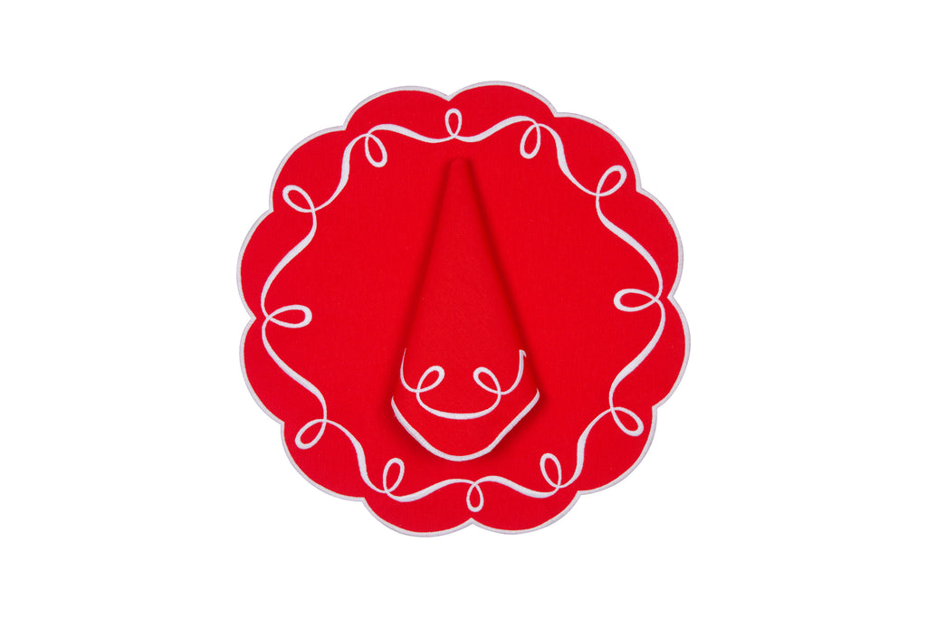 65% cotton, 35% polyester. Placemat and napkin set. Red and white colorway. Hand-finished edges. Made in Turkey.