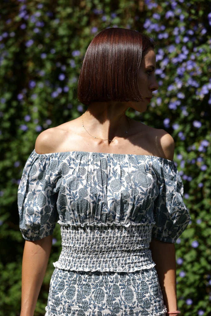 Hand printed on 100% cotton voile. Flattering smocked waist. Featherlight feel.