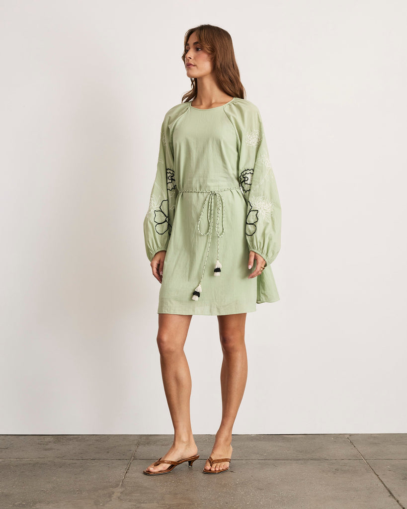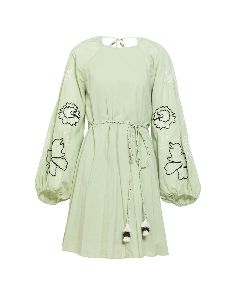 The Tay Dress in Sage captures effortless femininity through intricate embroidery and a breezy silhouette. Crafted from soft cotton voile, it features chrysanthemum-embroidered sleeves, an open back with an elasticated waist, and a beaded tassel tie that adds texture and charm. Designed for versatility, Tay transitions seamlessly from beachside lounging to alfresco evenings, embodying relaxed sophistication.