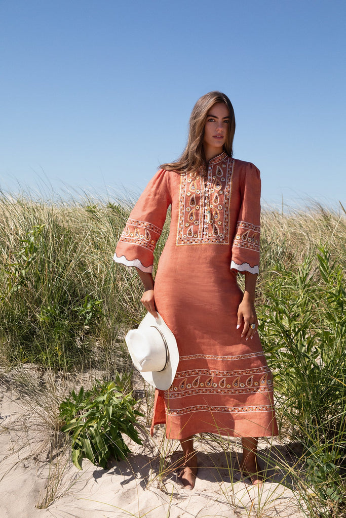 Inspired by art, architecture, and the founder’s global journeys, ASHA by Ashley McCormick introduces bold, sophisticated jewelry and accessories made from only the finest materials. From everyday glamour to the red carpet, these statement pieces are classic additions to your collection. The Terracotta Blythe Dress captures the spirit of a bohemian fall. In warm terracotta linen, it’s detailed with swirling paisleys and delicate floral embroidery that feel timeless and hand-touched. Scalloped cuffs and embroidered bands add a note of artistry to the clean silhouette, making it as effortless as it is refined. From barefoot walks through dune grass to evenings layered with gold jewelry, Blythe is made for autumn’s shifting light and moments of ease.