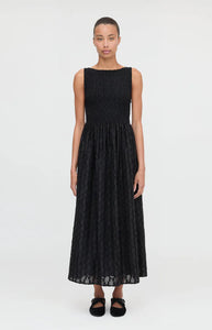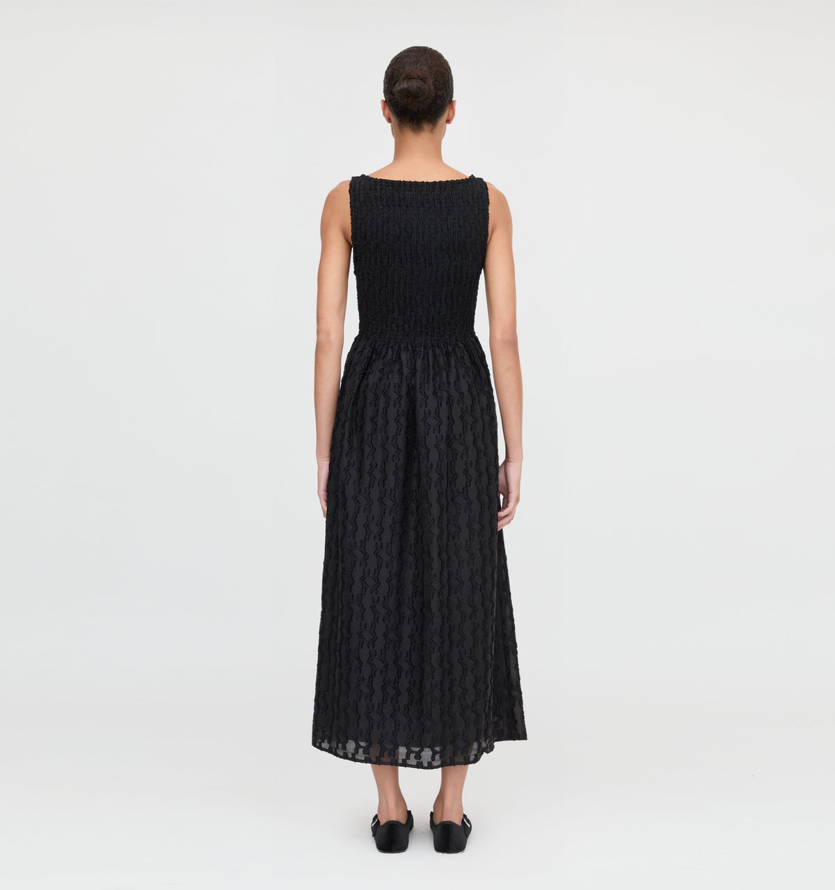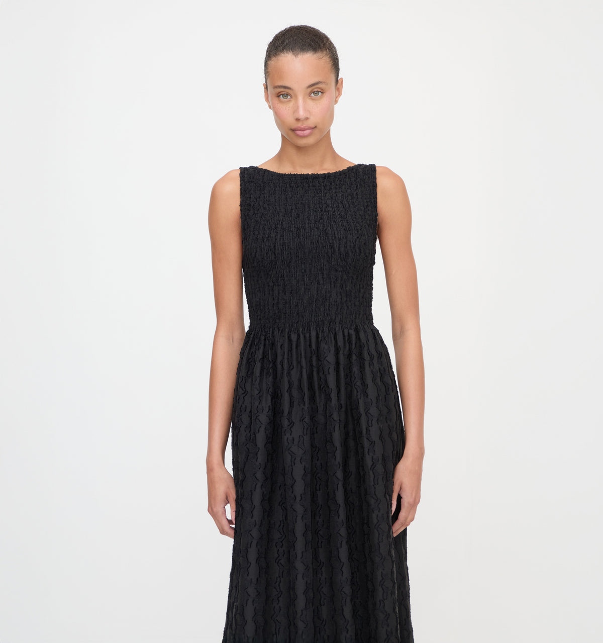 Hill House Home is a fashion and lifestyle brand that brings beauty and joy to everyday rituals. With a design-centric approach, Hill House offers impeccable quality, and timeless, delicate styles through quality products designed to enhance and celebrate life. The Cosima Nap Dress in Black Fil Coupe is an easy, elevated take on everyday dressing. Featuring a fully smocked, bra-friendly bodice and a crisp high boat neckline, this silhouette balances structure and softness for a look that can shift effortlessly from casual to dressed-up with just a few styling touches.