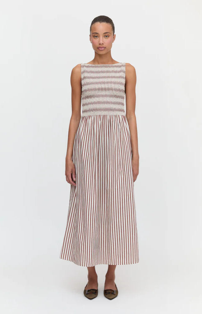 100% cotton. Smocked bodice with a high boat neckline. Bra-friendly straps. Falls to a midi length. Designed for versatile styling, from casual sandals to statement accessories. Rust and cream horizontal stripe pattern.
