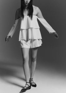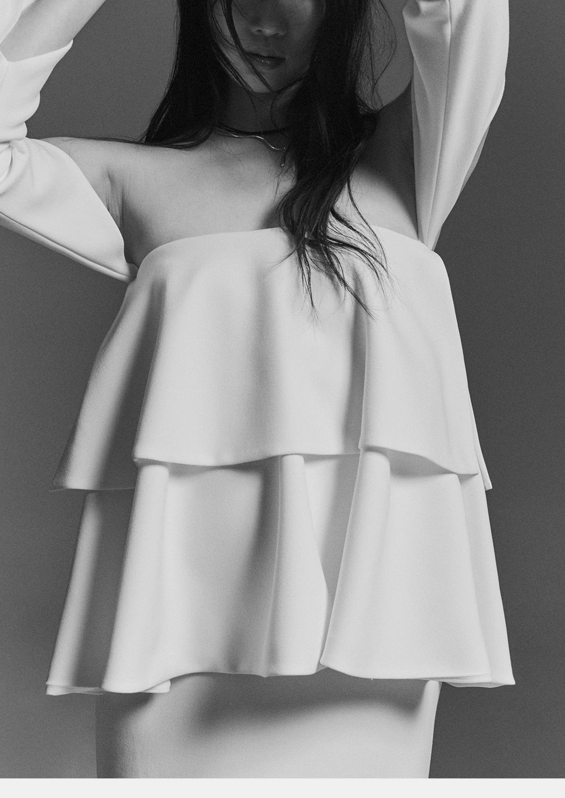 After honing her design vision and couture experience at Zac Posen, Narciso Rodriguez, and Chanel, Meredith Stoecklein emerges on her own with LEIN. The brand offers a new concept of tasteful, stylish wedding wear for the thoroughly modern bride. Graced with an off-the-shoulder cut, the Crepe Sarah Top cascades into tiers of delicate architectural ruffles. A study in elegance.