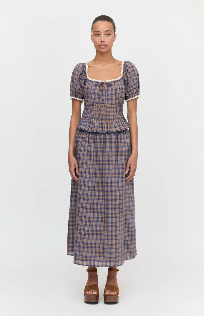 100% cotton. Midi length. Smocked elastic waistband for adjustable styling at the waist or hips. Brown Spencer Plaid print in shades of brown, teal, and cream.