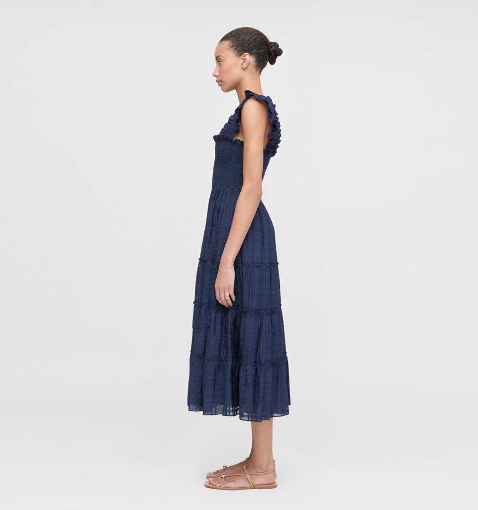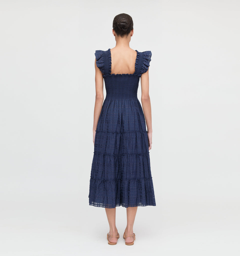 Hill House Home is a fashion and lifestyle brand that brings beauty and joy to everyday rituals. With a design-centric approach, Hill House offers impeccable quality, and timeless, delicate styles through quality products designed to enhance and celebrate life. The Ellie Nap Dress in Navy Sheer Plaid is soft, comfortable, and pretty enough to wear all day and night. It features an A-line style with elasticated Nap Smocking, ruffled shoulders, tiered midi skirt, and pockets.