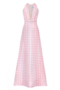 Born in India and raised in New York, where she eventually worked in finance, Natasha Das’s diverse background is at the essence of Danarys New York, a luxury womenswear label that asks its wearer to embrace their strength and fearlessness of their femininity. The Gigi Gown in Pink & White crafted from luxurious silk dupioni in a custom pink and white gingham print featuring floral dot flowers. This statement piece features a dramatic plunging V-neckline and a gracefully draped, floor-length silhouette designed to flatter every figure. A coordinating belt cinches the waist to highlight your natural curves, offering timeless sophistication with a modern twist.
