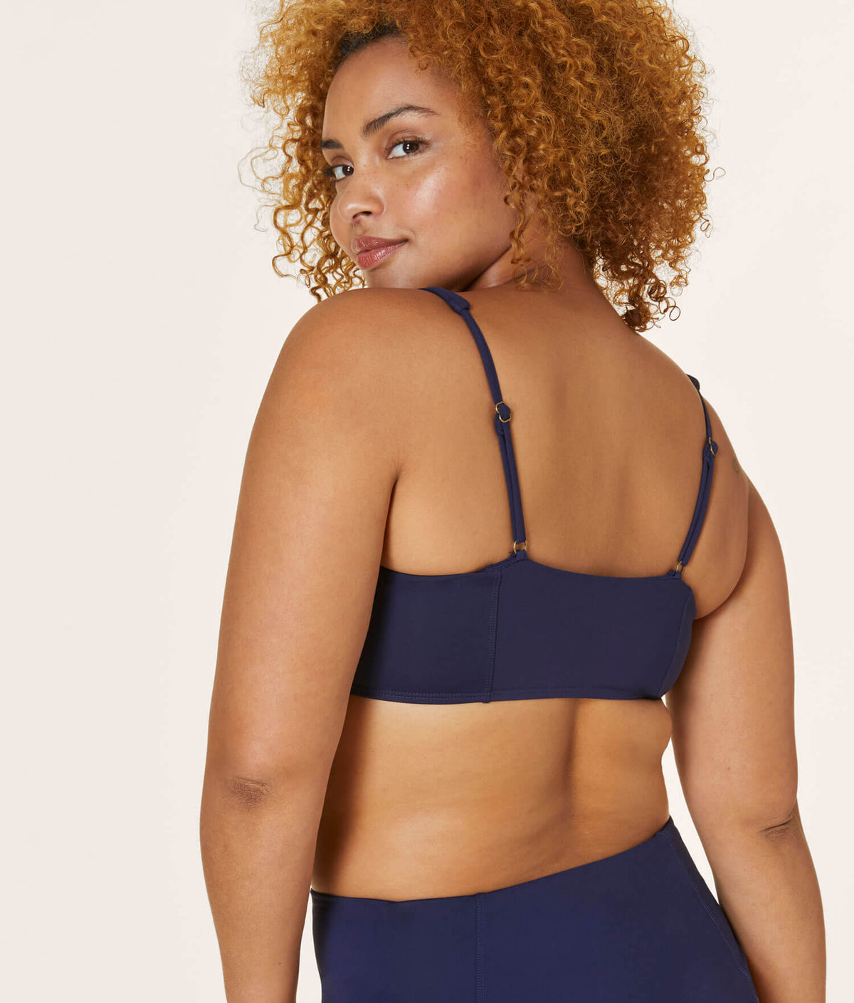 87% recycled polyester, 13% spandex. Adjustable straps. Removable soft cups. Light bust support. UPF 50+ sun protection.