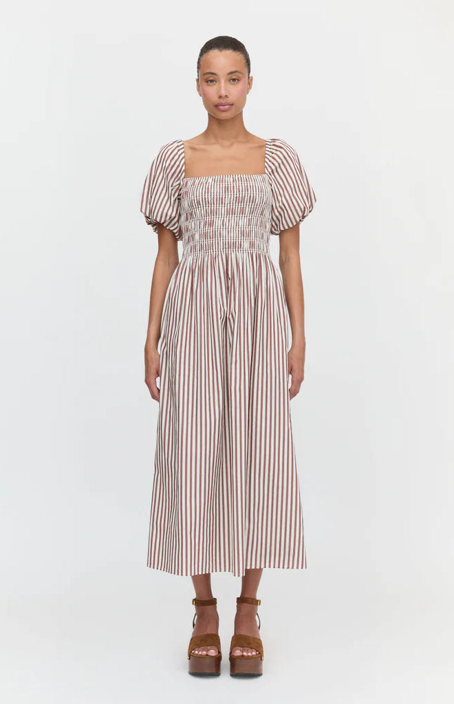 100% cotton. Midi length. Square neckline with puff sleeves. Fully smocked bodice. Side pockets. Rust and cream horizontal stripe pattern.